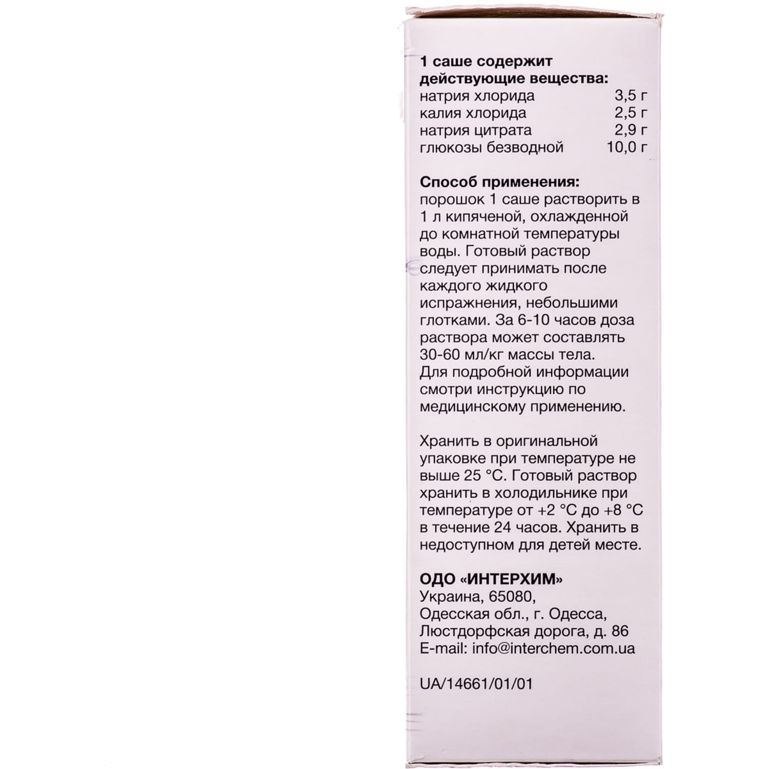 1 sachet contains sodium chloride 3.5 g, potassium chloride 2.5 g, sodium citrate 2.9 g, glucose 10.0 g