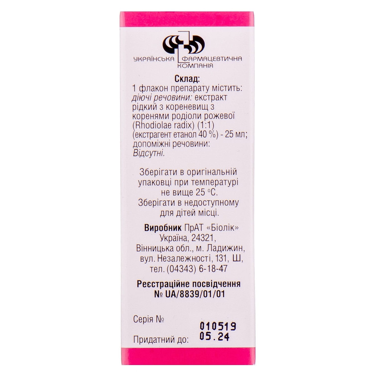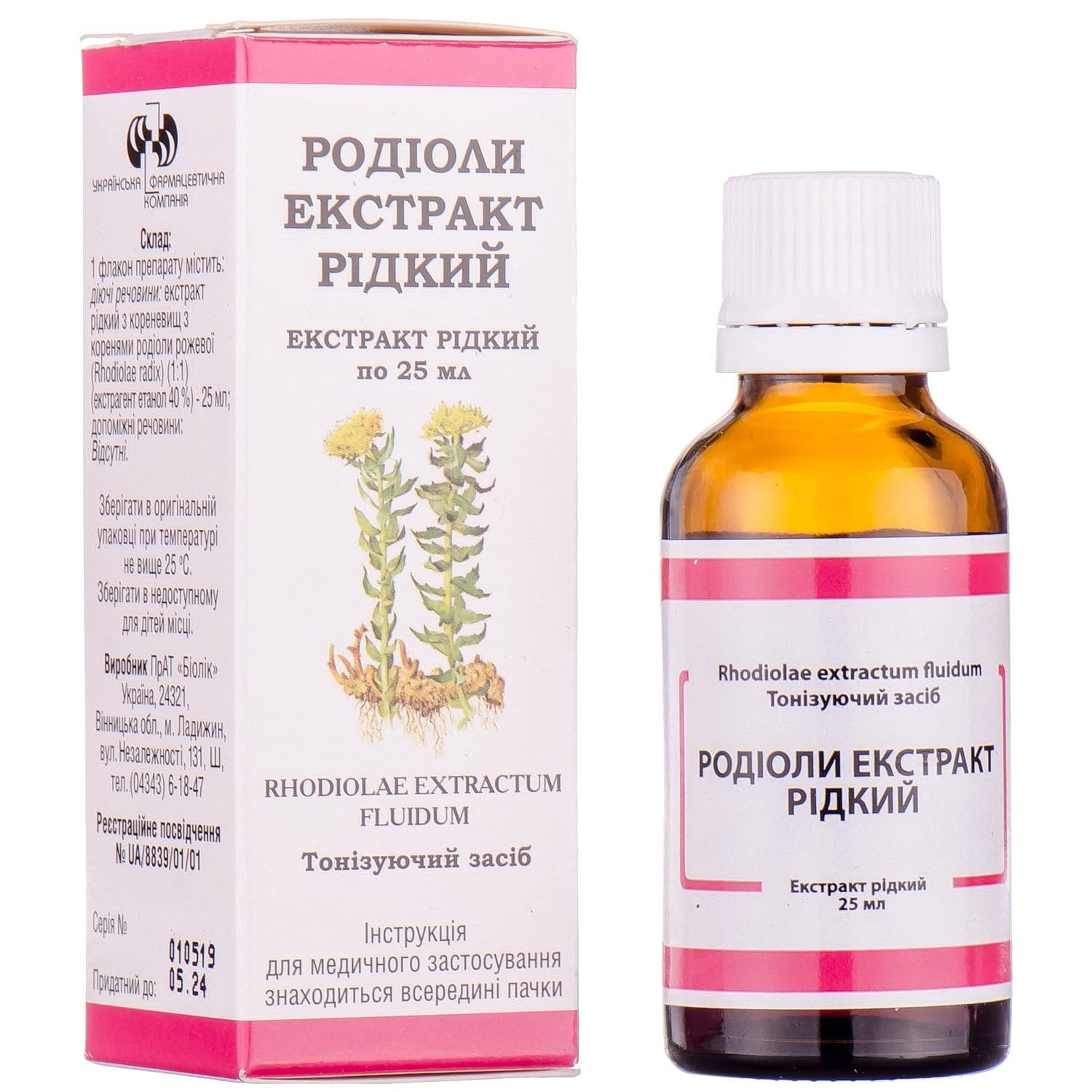 Active ingredient – liquid extract from rhizomes with roots of Rhodiola rosea (Rhodiola radix). One bottle of the drug contains liquid extract from rhizomes with roots of Rhodiola rosea (Rhodiola radix) (1: 1) (extractant – ethanol 40%) 25 ml.