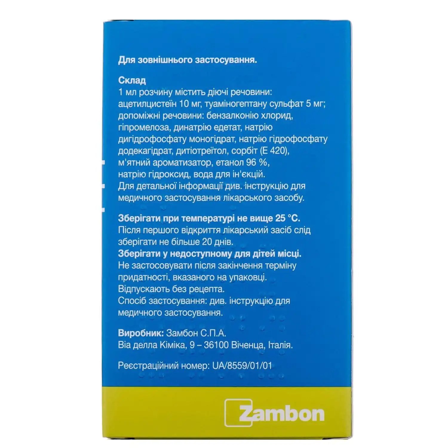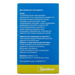 Active ingredients: 1 ml of the drug contains acetylcysteine ​​- 10 mg, tuaminoheptane sulfate – 5 mg; excipients: benzalkonium chloride, hydroxypropylmethylcellulose, sodium edetate, sodium phosphate monohydrate, sodium hydrogen phosphate dodecahydrate, dithiothreitol, sorbitol (E 420), mint flavoring, ethanol 96%, sodium hydroxide, water for injection.