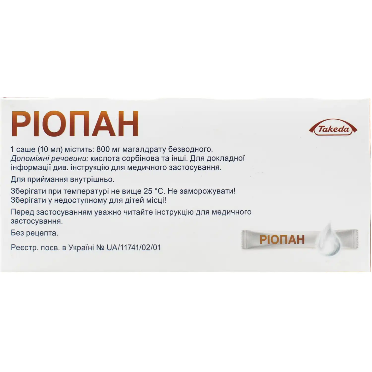 Riopan oral suspension. Adults: the recommended dose is 1 sachet of Riopan.
