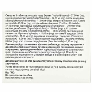 Composition for 1 tablet: powders of Yashad Bhasma (Yashad Bhasma) – 37.50 mg (mg), Shilajit Shuddha – 37.50 mg (mg), fruits of Momordica charantia (Momordica charantia) – 12.00 mg (mg), extracts: cassia seeds (Cassia auriculata) – 45.00 mg (mg), fruits of Emblica officinalis (Emblica officinalis) – 37.45 mg (mg), rhizomes of long turmeric (Curcuma longa) – 30.00 mg (mg), jambolana seeds (Eugenia jambolana) – 15.00 mg (mg), whole Enicostemma littorale plant (Enicostemma littorale) – 11.00 mg (mg), gymnema sylvestre leaves (Gymnema sylvestre) – 11.00 mg (mg ), Melia azadirachta leaves – 11.00 mg (mg), Pterocarpus marsupium core – 8.00 mg (mg), Tinospora cordifolia stem – 8.00 mg (mg), of the whole plant of Swertia chirata (Swertia chirata) – 1.25 mg (mg).