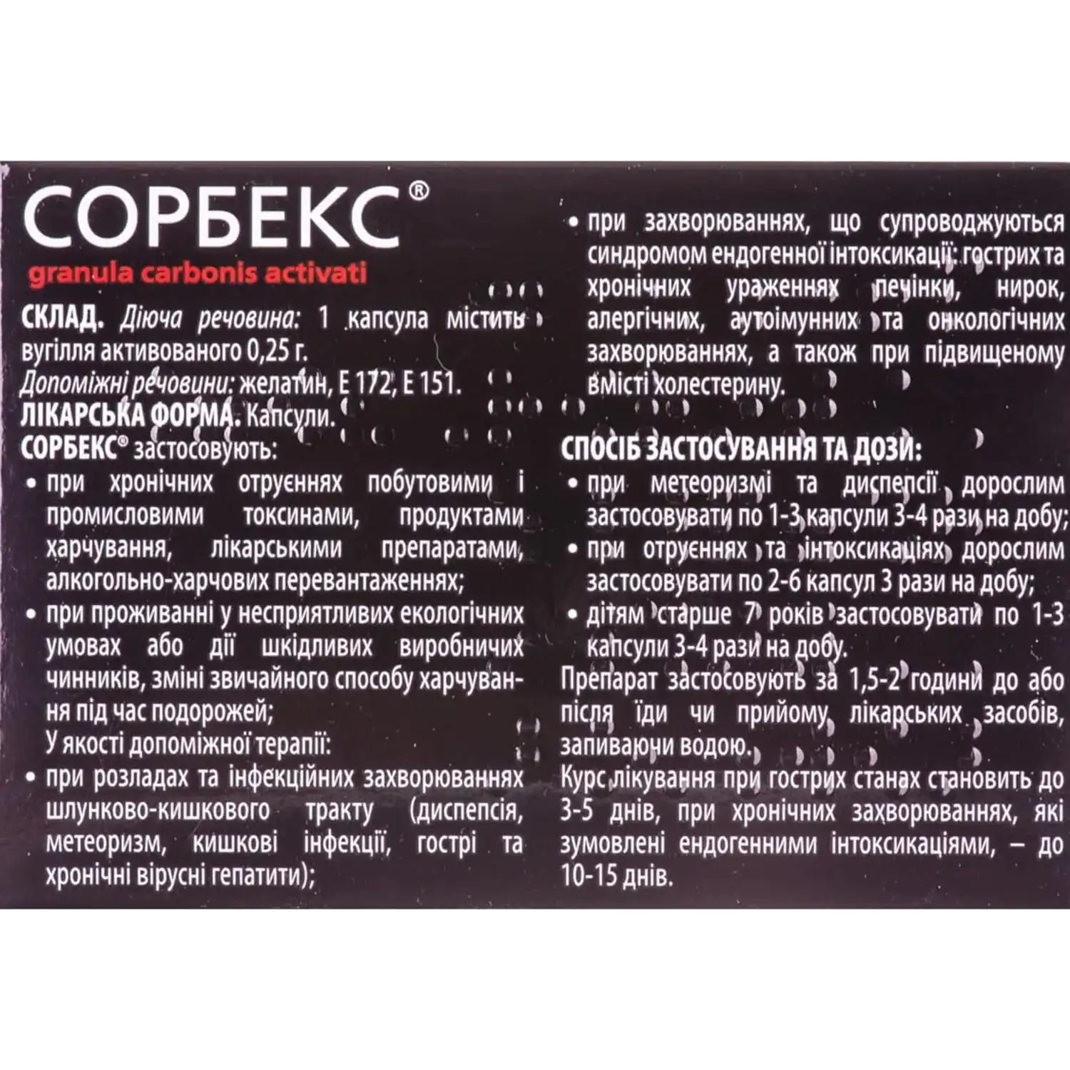 Sorbex is a medicinal product that contains granulated activated carbon, which is obtained from natural plant raw materials.