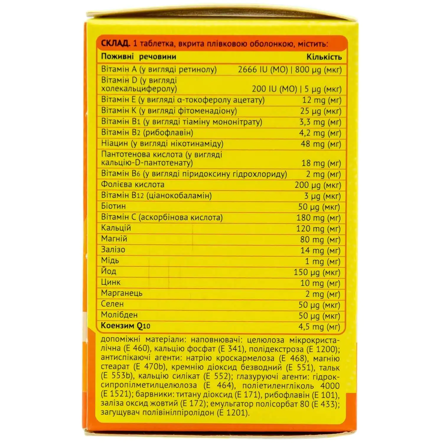Excipients: microcrystalline cellulose (E460), croscarmellose sodium (E468), magnesium stearate (E470b), anhydrous silicon dioxide (E551), polyvinylpyrrolidone (E1201), calcium phosphate (E341), silicon dioxide, calcium silicate (E552), hydroxypropyl methylcellulose (E464), titanium dioxide (E171), polydextrose (E1200), talc (E553b), polyethylene glycol 4000 (E1521), riboflavin (E101), yellow iron oxide (E172), polysorbate 80 (E433), carnauba wax (E903), purified water. Does not contain GMOs.