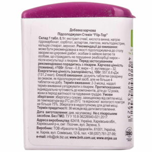1 tablet of 0.1 g: stevia extract, tartaric acid, sodium bicarbonate, sorbitol, aspartame, lactose, maltodextrin, calcium stearate, aerosil.