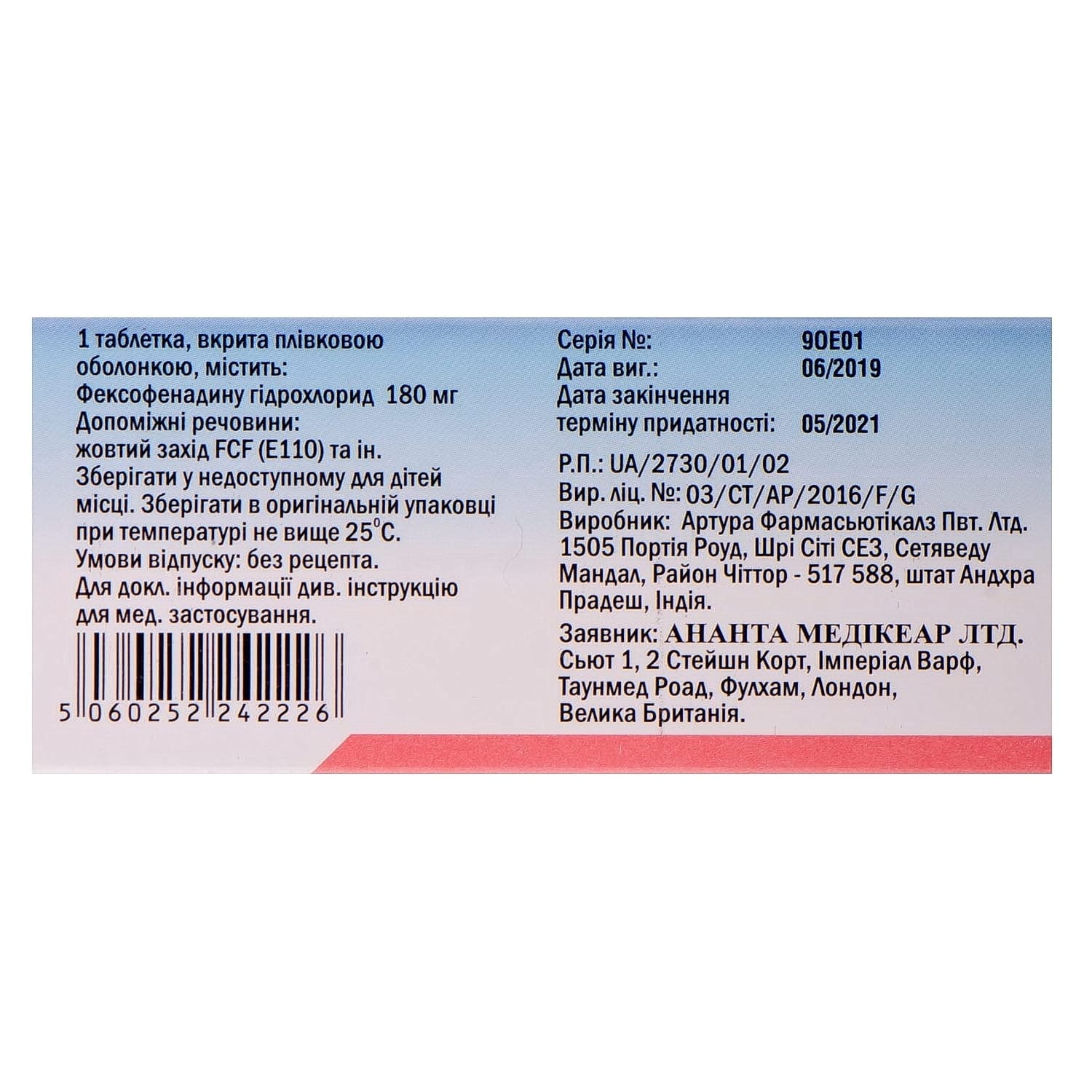 The active substance is fexofenadine hydrochloride (one film-coated tablet contains 180 mg of fexofenadine hydrochloride).