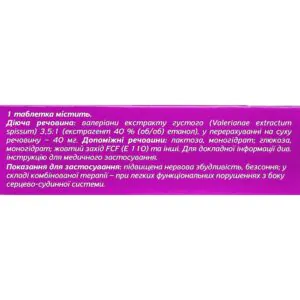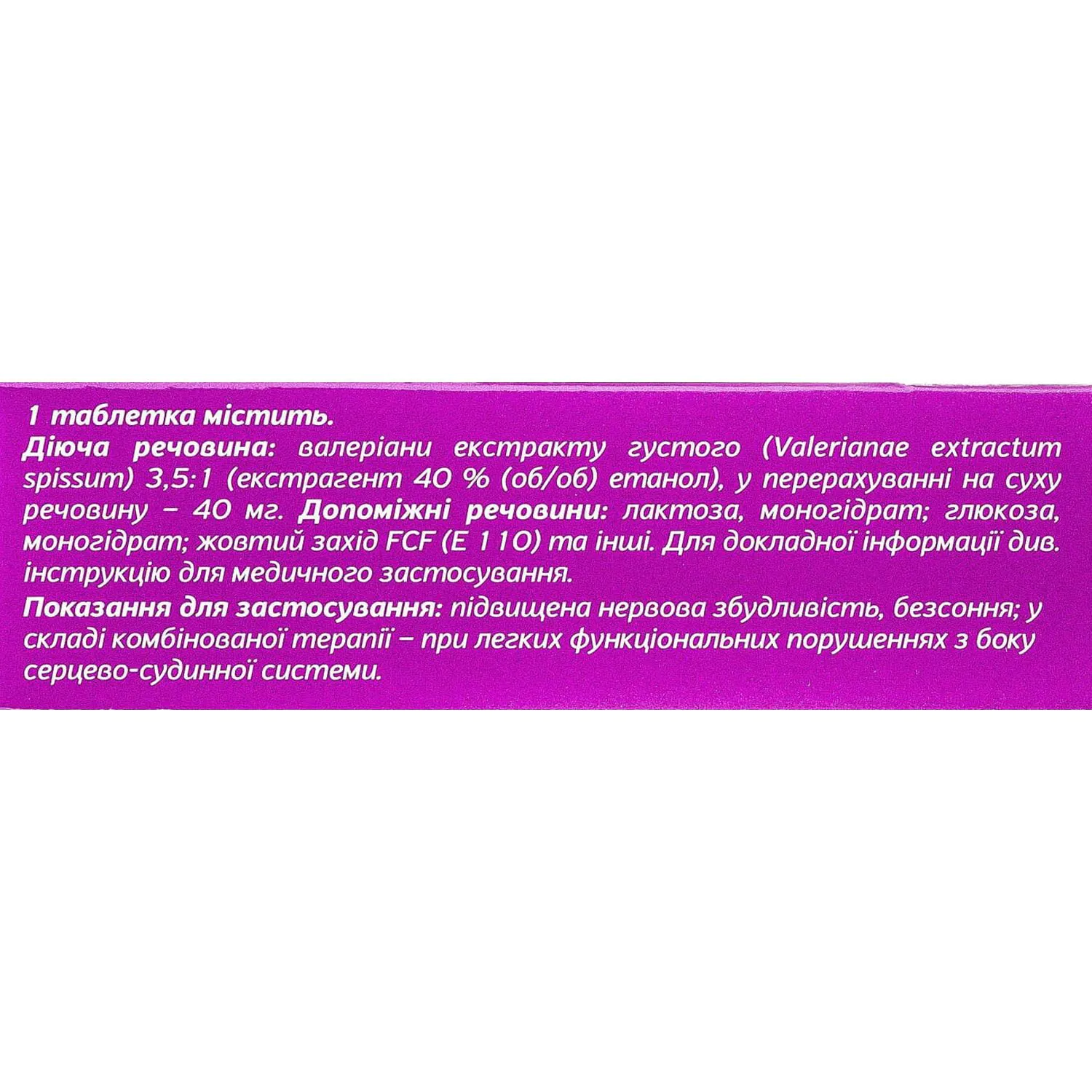 active substance: 1 tablet contains valerian thick extract (Valerianae extractum spissum) 3.5:1 (extractant 40% (v/v) ethanol) in terms of dry matter – 40 mg;