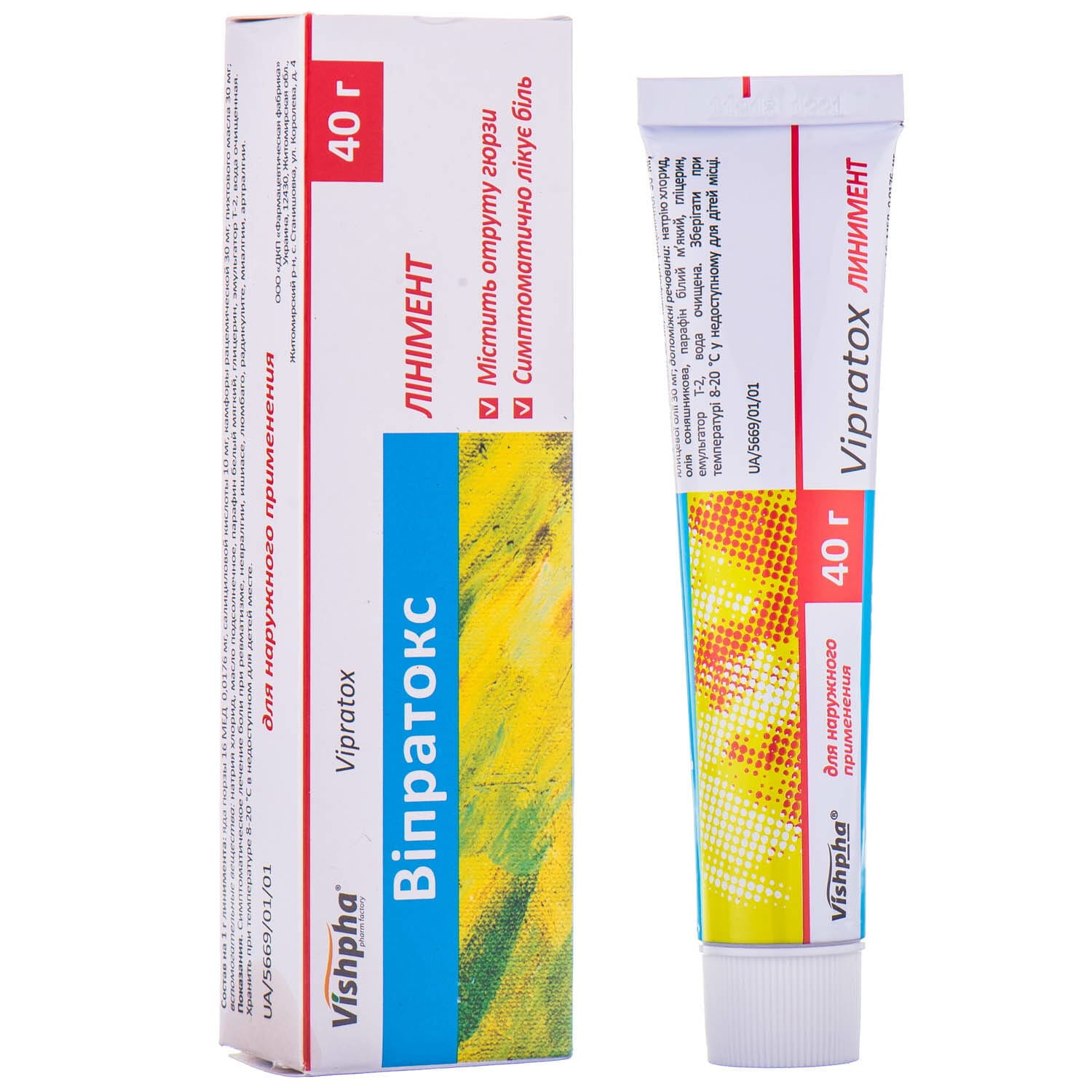Pharmacodynamics. Gyurza venom (venenum macroviperae lebetina), containing phospholipase, phosphodiesterase, hyaluronidase, and other active substances, is the key active ingredient of Vipratox liniment. The pharmacological action of Vipratox liniment is caused by toxins that are part of the gyurza venom. Postsynaptic neurotoxins provide specific blockade of n-cholinoreceptors of the subsynaptic membrane of skeletal muscles and certain parts of the central nervous system. Presynaptic nerve endings are affected by presynaptic neurotoxins, which contribute to increased secretion of mediators. Actively affecting cell membranes, membrane-active neurotoxins (cardiotoxins, cytotoxins, which are polypeptides in chemical structure) cause their depolarization, including.