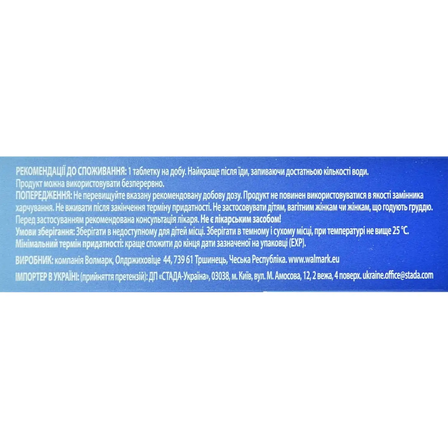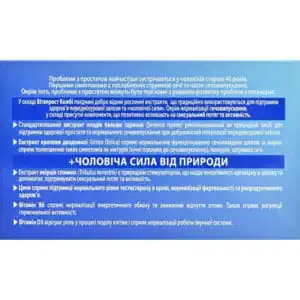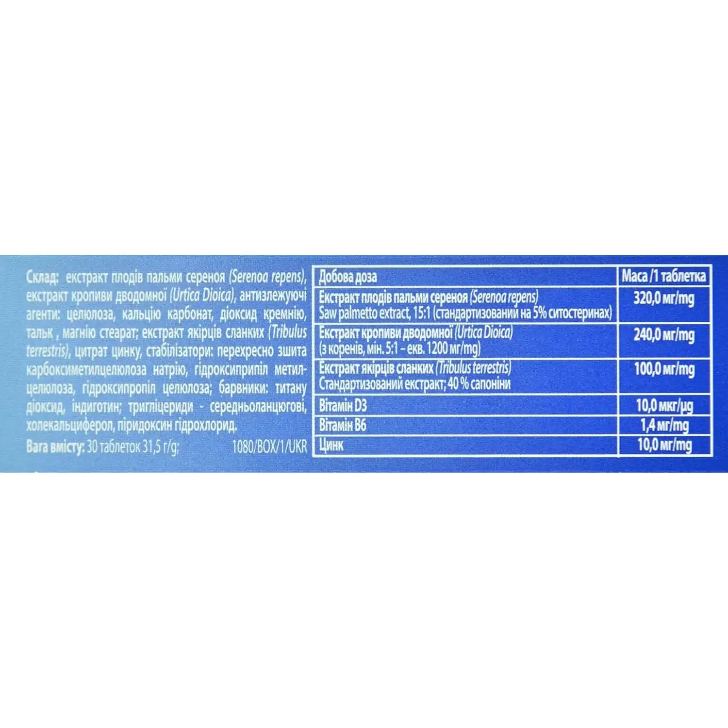Saw palmetto fruit extract (Serenoa repens), nettle extract (Urtica Dioica), anti-caking agents: cellulose, calcium carbonate, silicon dioxide, talc, magnesium stearate; Tribulus terrestris extract, zinc citrate, stabilizers: cross-linked sodium carboxymethylcellulose, hydroxypropyl methylcellulose, hydroxypropyl cellulose; dyes: titanium dioxide, indigotine; medium-chain triglycerides, cholecalciferol, pyridoxine hydrochloride.