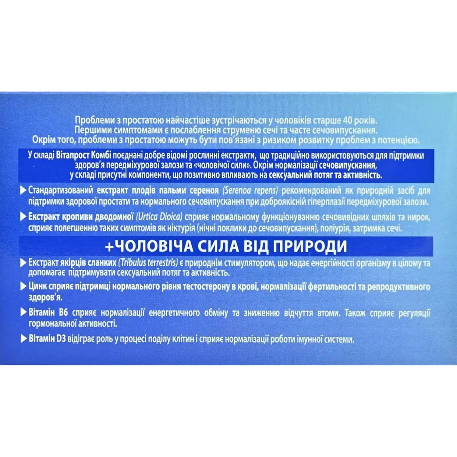Vitaprost Combi is a dietary supplement that supports prostate health and male vitality, helping maintain normal urination, libido and hormonal balance.
