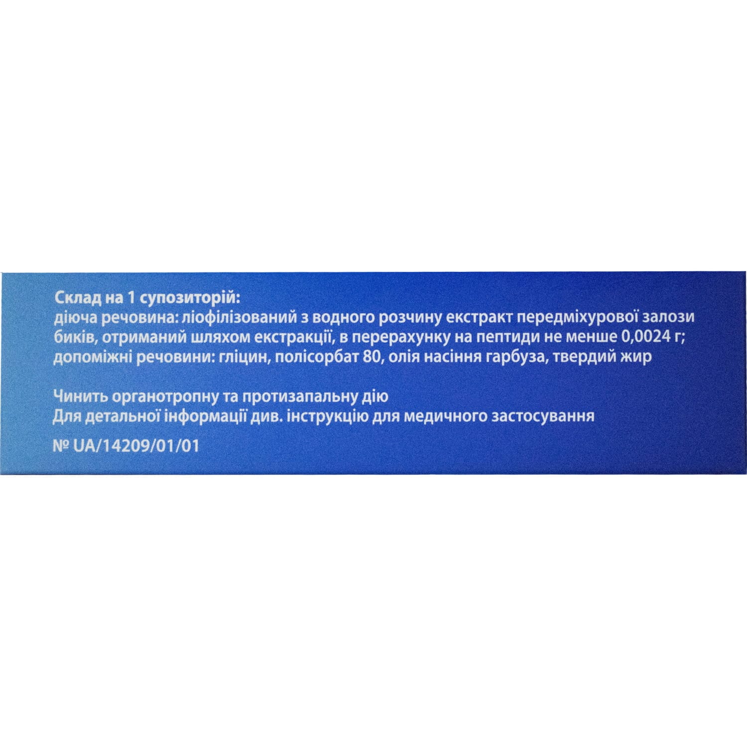 - active ingredient: 1 suppository contains lyophilized from an aqueous solution of bovine prostate extract obtained by extraction, in terms of peptides, not less than 0.0024 g;