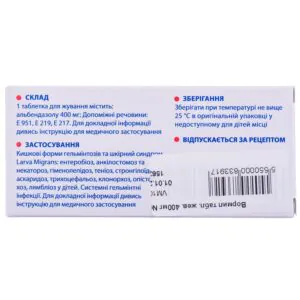 - Strongyloidiasis, teniasis, hymenolepidosis: adults and children aged 2 years and over – 400 mg 1 time / day (one tablet) for 3 days; for hymenolepidosis, a repeated course of treatment is recommended in the interval from the 10th to the 21st day after the previous course;